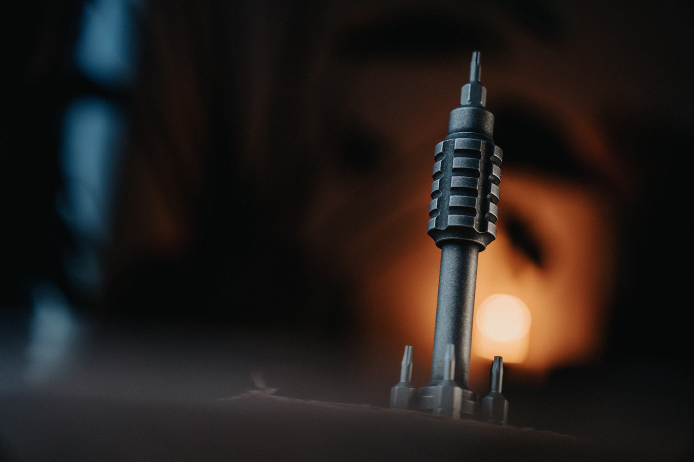 The MK2 driver is designed for those who enjoy fixing and maintaining their gear. The large grip area and pattern milling allow for extra torque and the bearing in the cap runs smoothly. The magnetic tip securely holds standard 1/4" hex bits and you can even store 3 of them inside the driver, which is extremely handy. Built like a tank, machined in Canada out of titanium