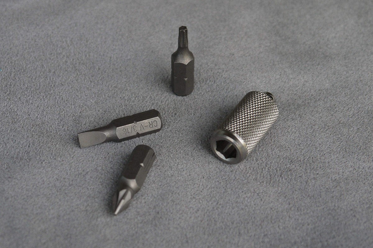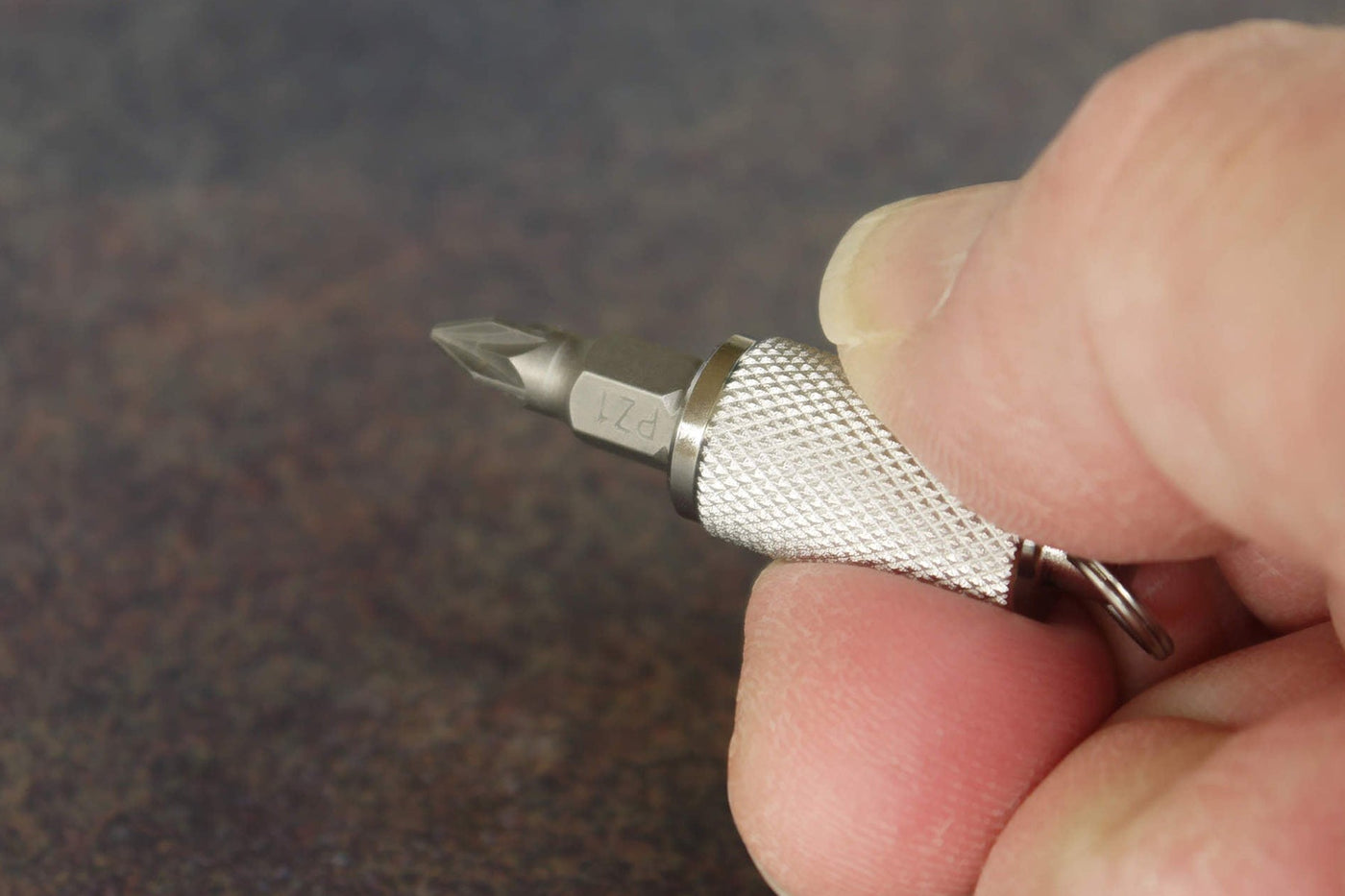 The Tiny-Torq is a keychain sized bit wrench that accepts standard 1/4" hex bits. It's small size and miniscule weight makes it the perfect accessory for your keychain or bag, conveniently ready for the times you'll need it most. The knurling on the ourside allows for a positive grip, and the embedded neodymium magnet prevents your hex bits from falling out during use.