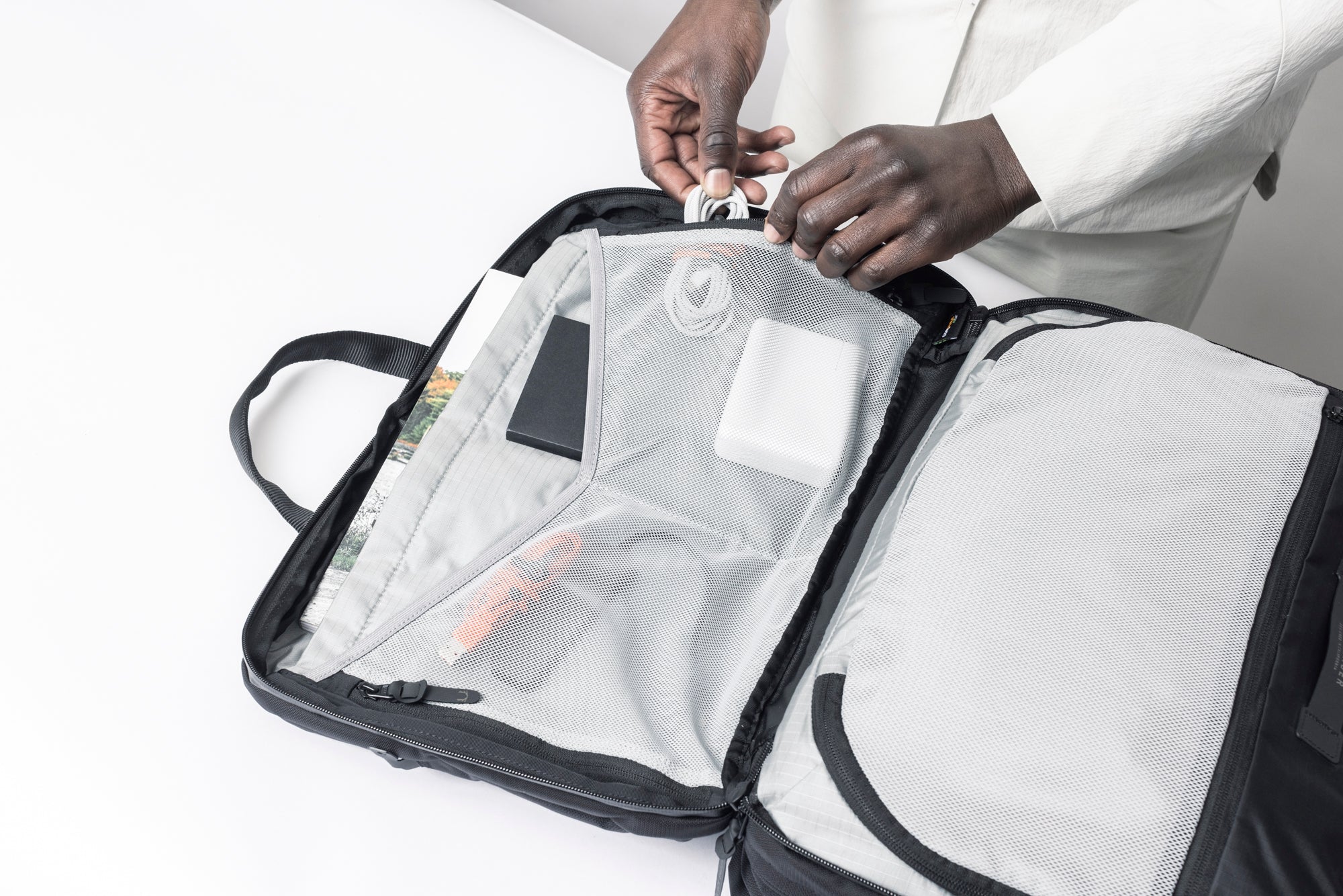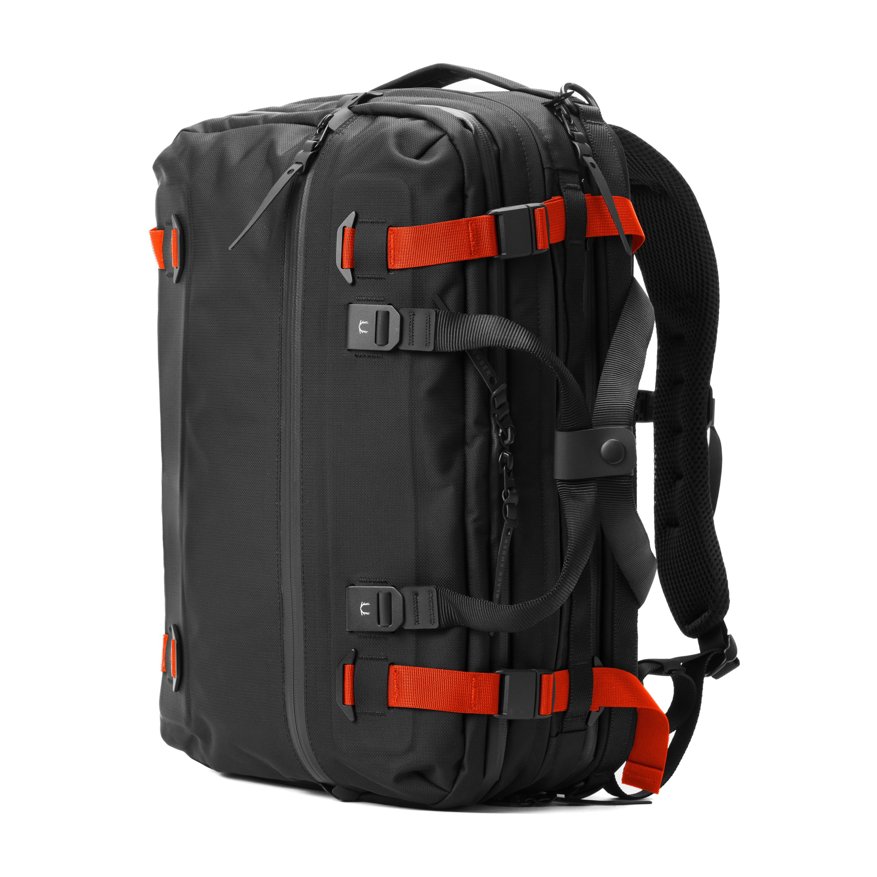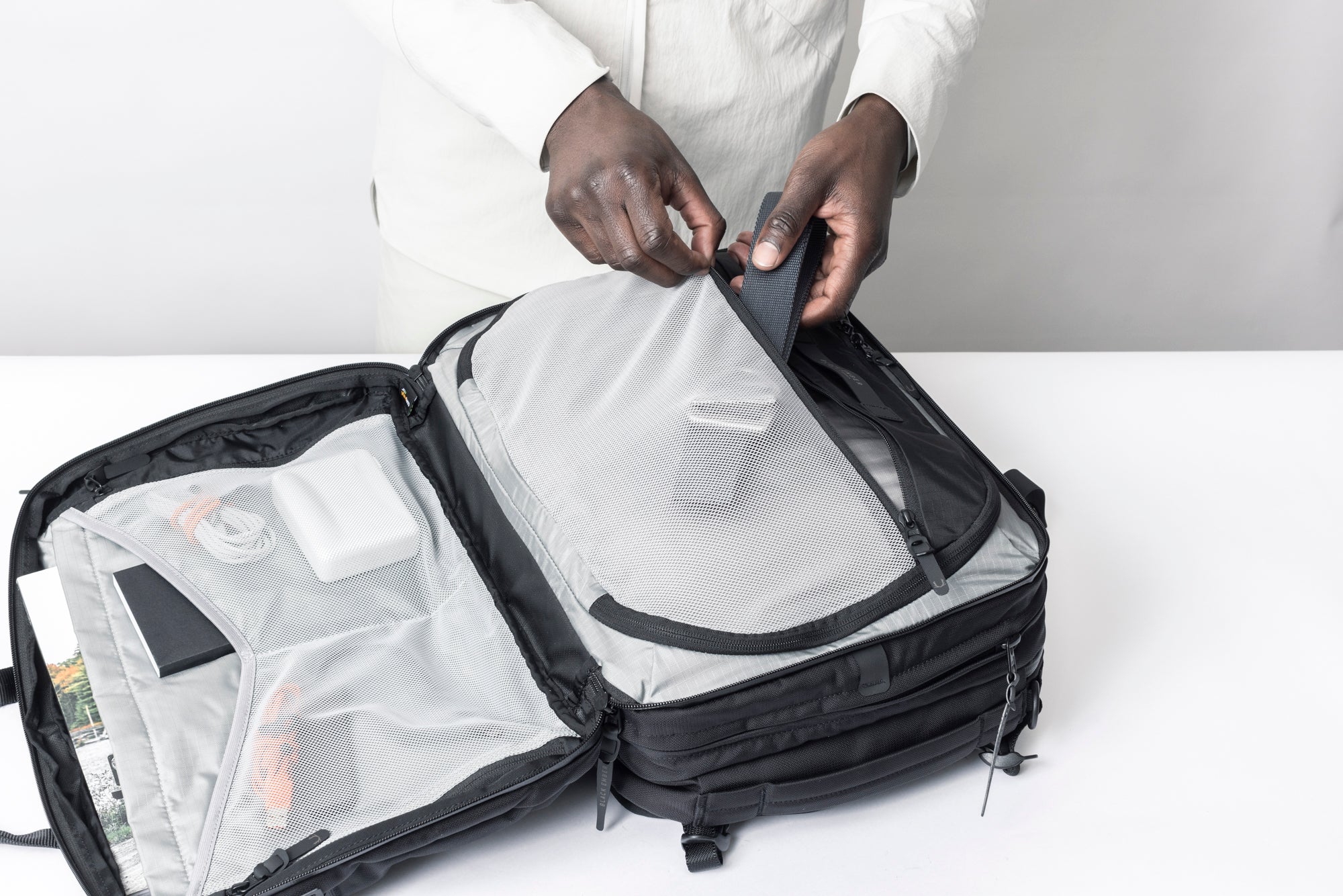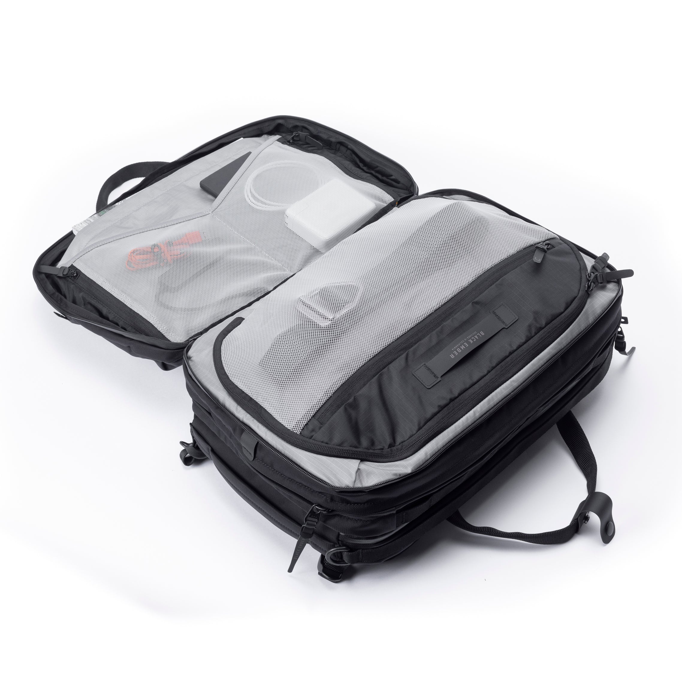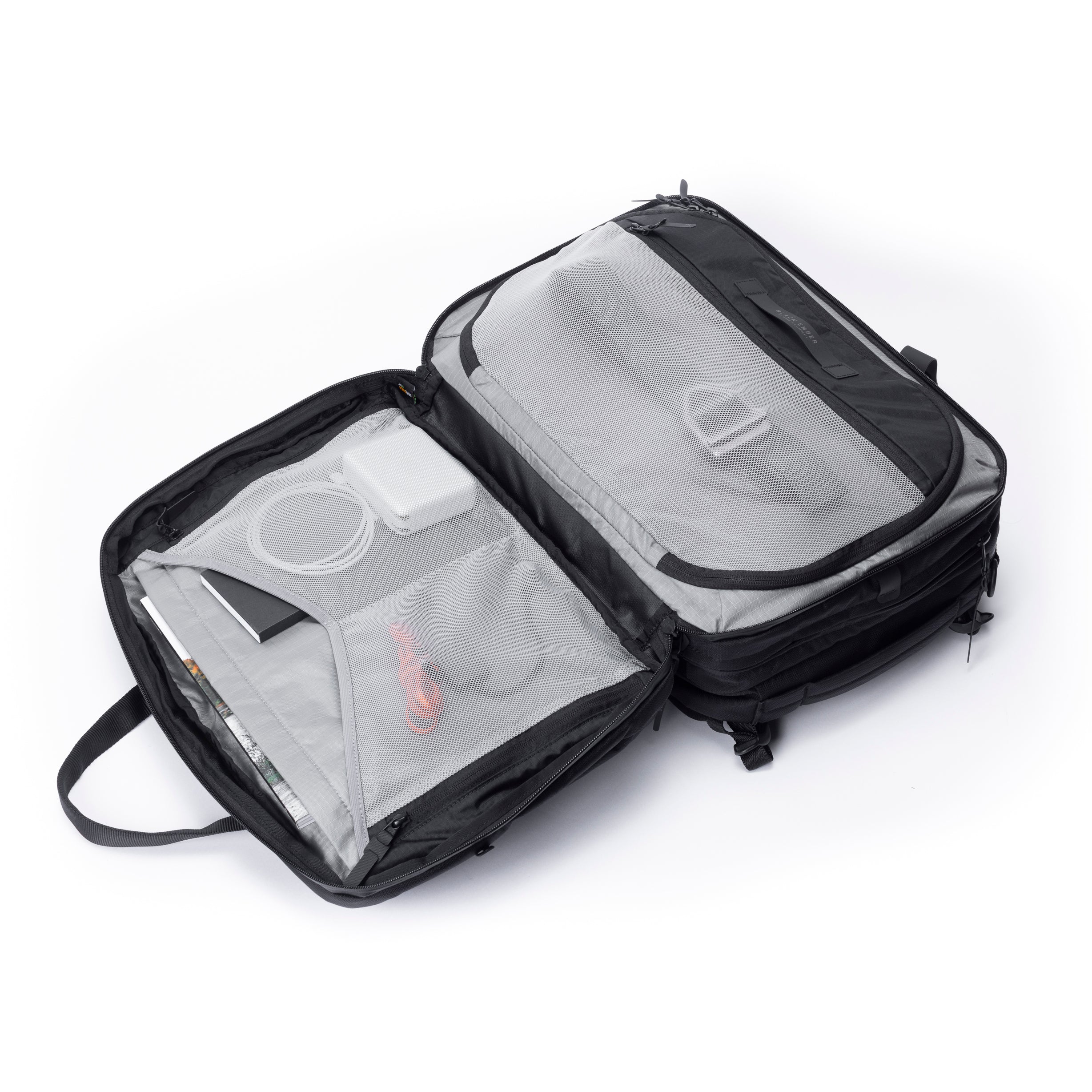 The Forge unzips and divides into two separate sections: The organization panel has a place for everything while the storage compartment is made for clothing and bulky items. For long term travel: grab the expansion zipper. The Forge instantly expands from 20 to 30 liters. If you max out the storage space, compress the Forge with the included magnetic compression straps.