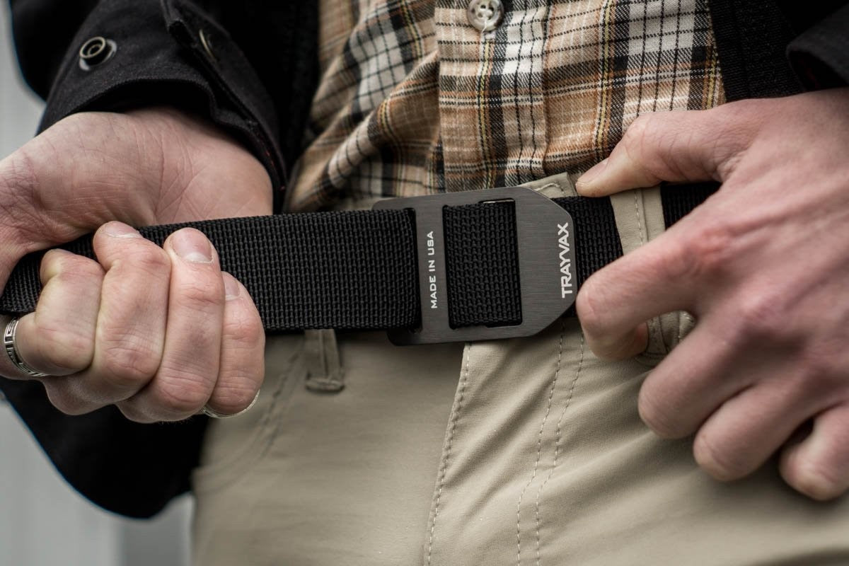 The Trayvax Cinch is a minimalistic, tough web belt which uses friction for instant tensioning and hassle-free locking. It is made with heavy-duty nylon webbing, secured with a double tension-point aluminum buckle. The light brush-grain pattern provides a smooth and attractive appearance while staying true to the rugged, minimalistic designs that have come to embody Trayvax.